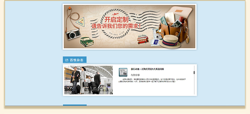 百悦逸游于2012年初由二位资深的旅行家创办,是成都传媒集团旗下成都新闻国际旅行社有限公司的高端旅游品牌,总部位于成都高新区天府大道中段美年广场。在百悦逸游成立之前,创始团队亲自到全球三十多个国家实地考察,带着第一手的资讯和执着的信念创立了中国西部第一家真正意义上的私人定制旅行机构。百悦的旅行不是跟团挤大巴,不是十天去十个国家,更不是没完没了的...
